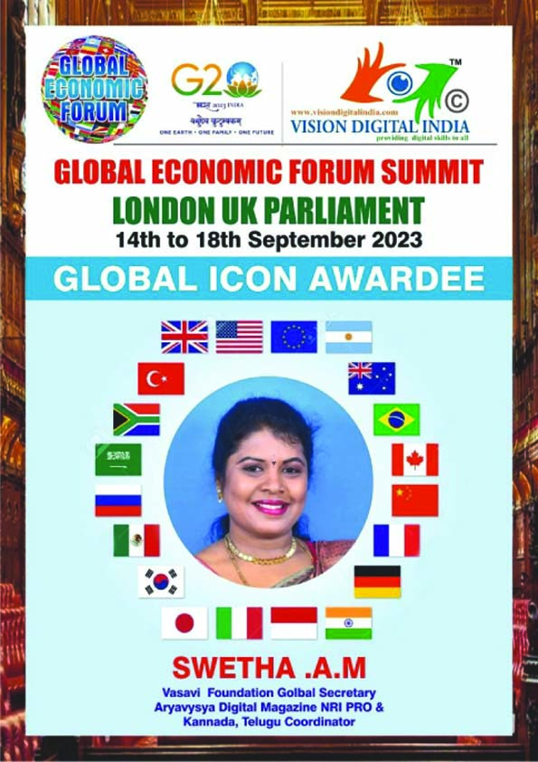 Arya Vysya Youth Credentials will be published here and promoted to the global community. Smt. Swetha Ganjam, Bagepalli is going to receive Global Icon Award for her restless social and community activities.