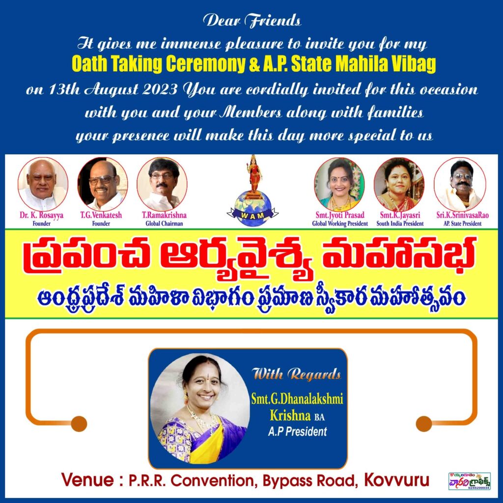 Wam Ap Mahila vibhag state president గా 13వ తారీకు ఆదివారం కొవ్వూరులో ప్రమాణ స్వీకార మహోత్సవం