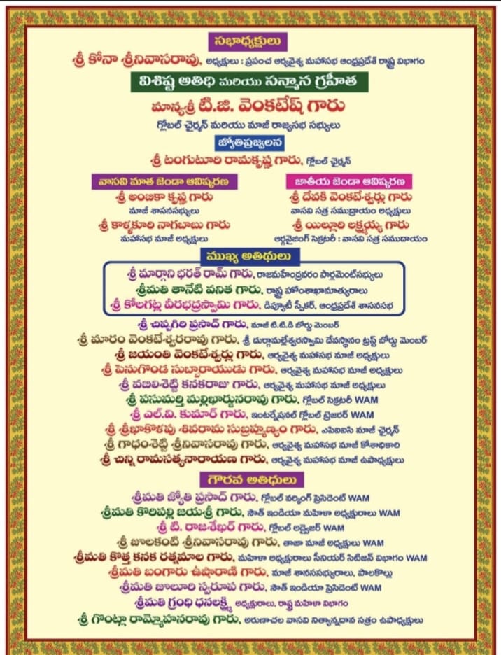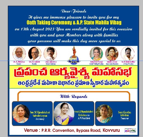 Grandhi Dhanalakshmi Krishna B.A. Honourable A.P. State President was appointed as A.P. State Mahila Vibhag President oath taking ceremony on 13-8-2023. On this happiest occassion we the team members of Vasavi Foundation congratulaing her.