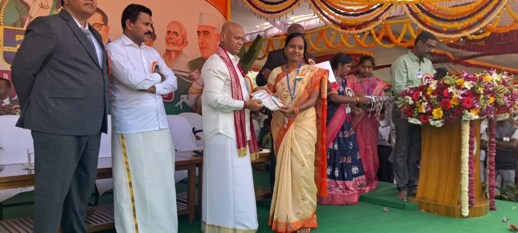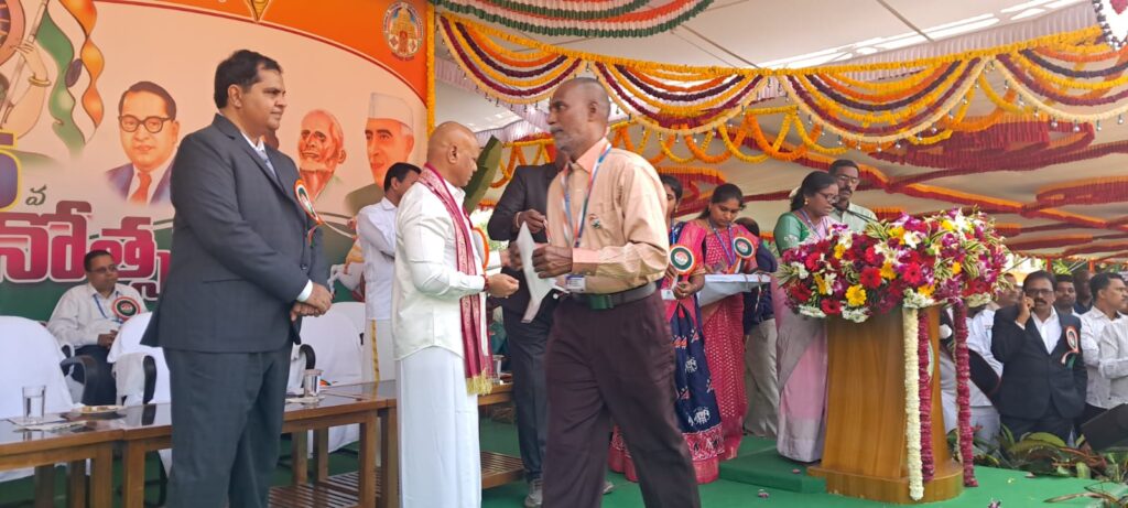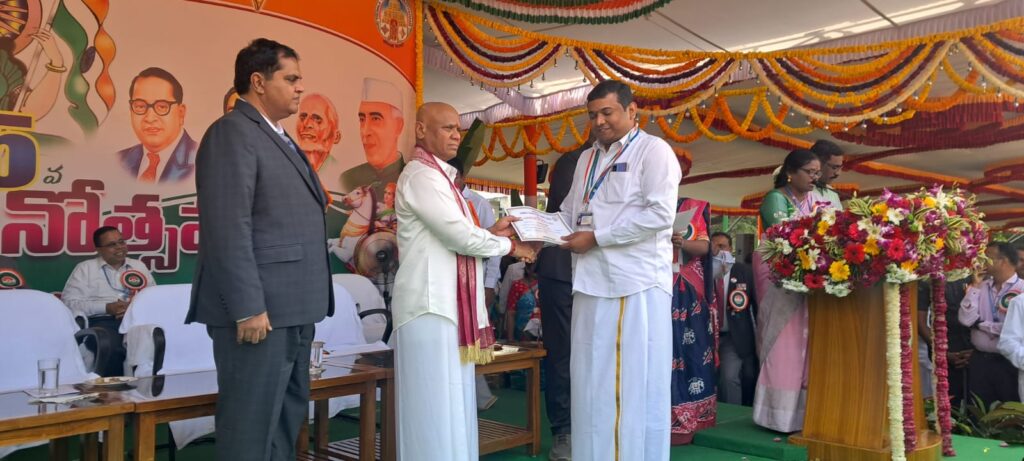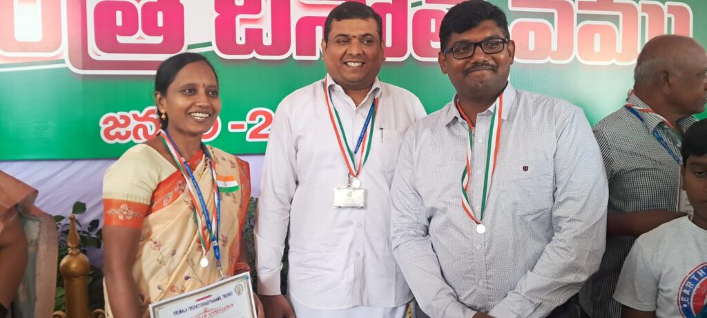 Vasavi Foundation team members congratulating our community awardees on the occassion of Republic Day Celebrations in TTD, Tirupati. Sri T Venkata Ramana, Chief Accounts Officer. Sri K Srinivasa Kumar, Reader (Ayurvedic) (PG). Sri K Srinivas, Assistant Accounts Officer, Smt. B Rajitha, Junior Assistant, O/o CAO.