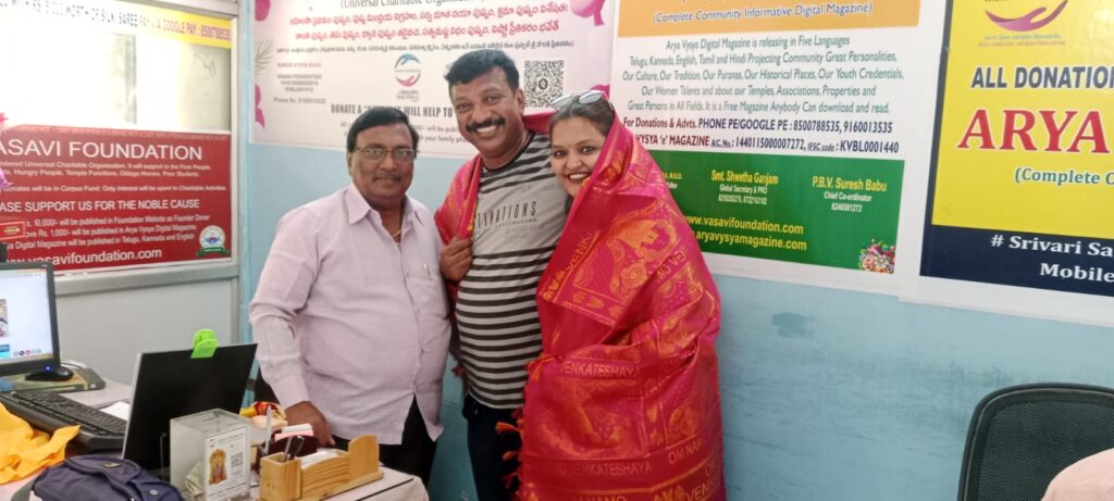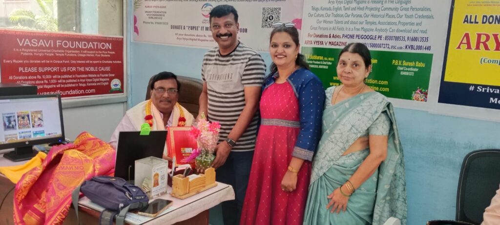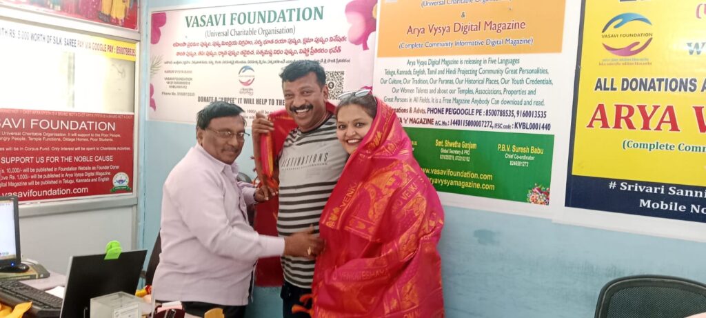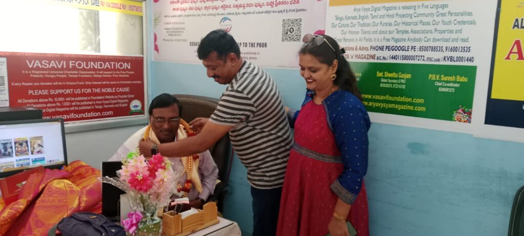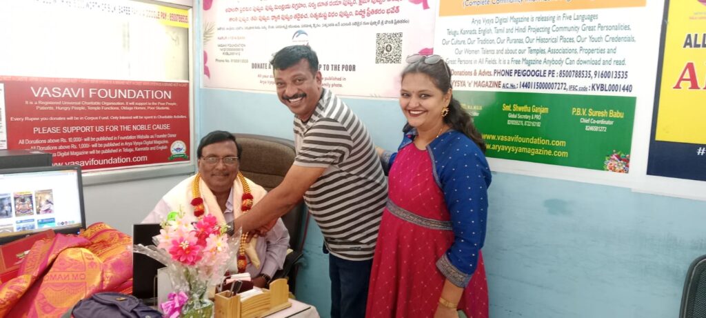 Smt. Dr. Lalitha and Dr. Bharat Chief Advisor, Vasavi Foundation, Karnataka visited our premises in Tirupathi and honoured me and offered a donation to our Foundation.