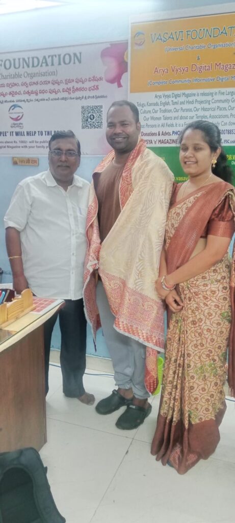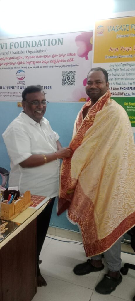Sri Swaraj, Telangana State Secretary, Vasavi Foundation visited our office in Tirupathi. He promised to start Arya Vysya Digital Magazine in Hindi and support to expand our foundation in Maharasthra.