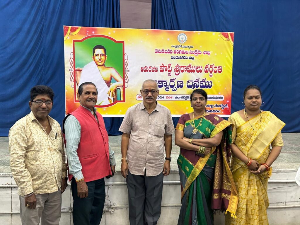 Conduct of Potti Sreeramulu vardhanthi at Vizianagaram. Maitreyi Mahila Vibhag, Vizianagaram. Team members of the Mahila Vibhag extended their respect to Sri Potti Sreeramulu.