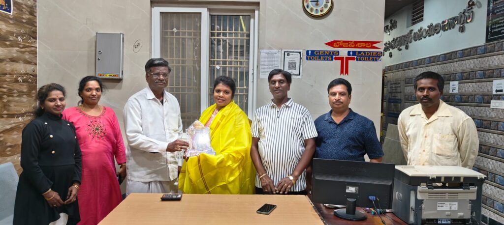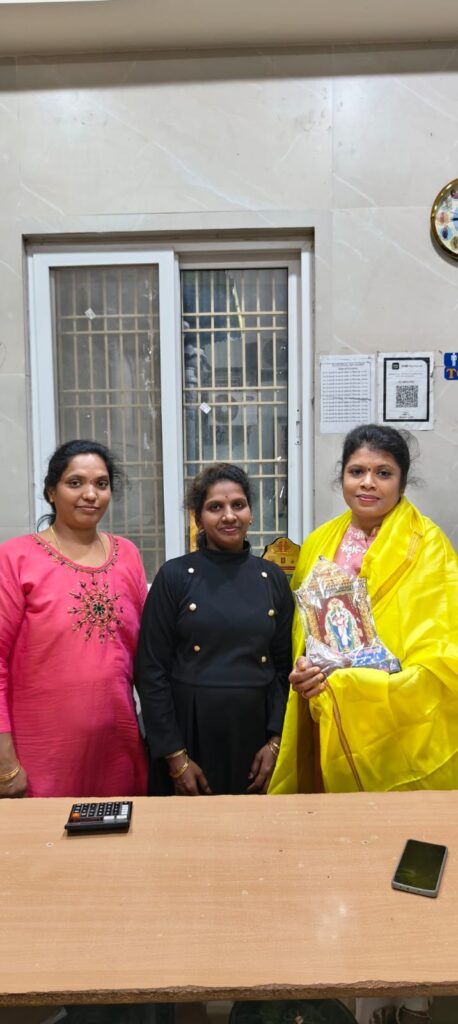 Smt. Swetha Ganjam, A.M. Global Secretary recently visited Jogulamba Temple, Alampur and Visited Allampuri Jogollamaba Arya Vysya Sangha Nithya Annadham Committee President Sri Ramesh garu. The President of the Sangham hounerd her with Vasavi Amma Shesha Vastram and with Sri Charaka Kumkum.