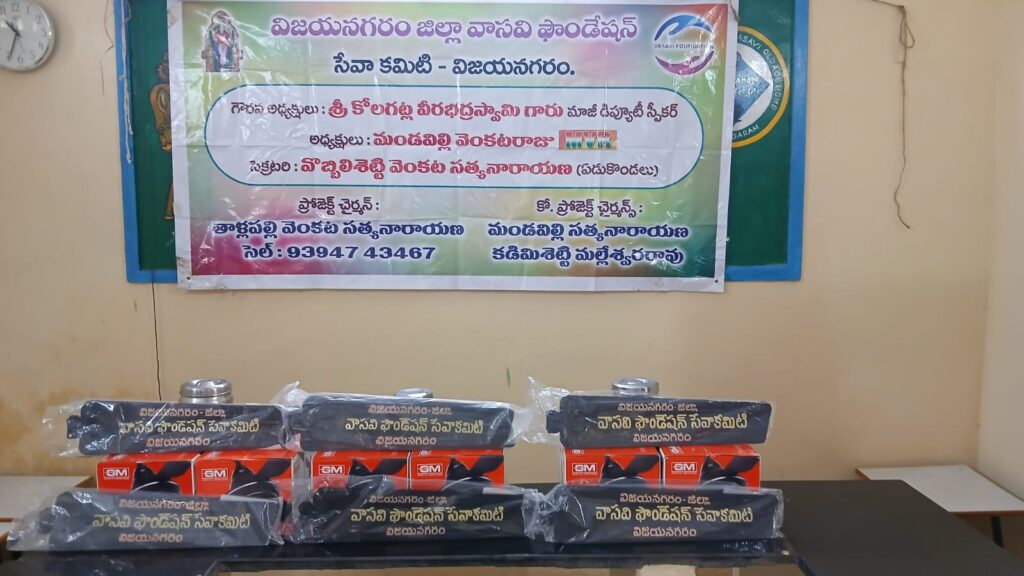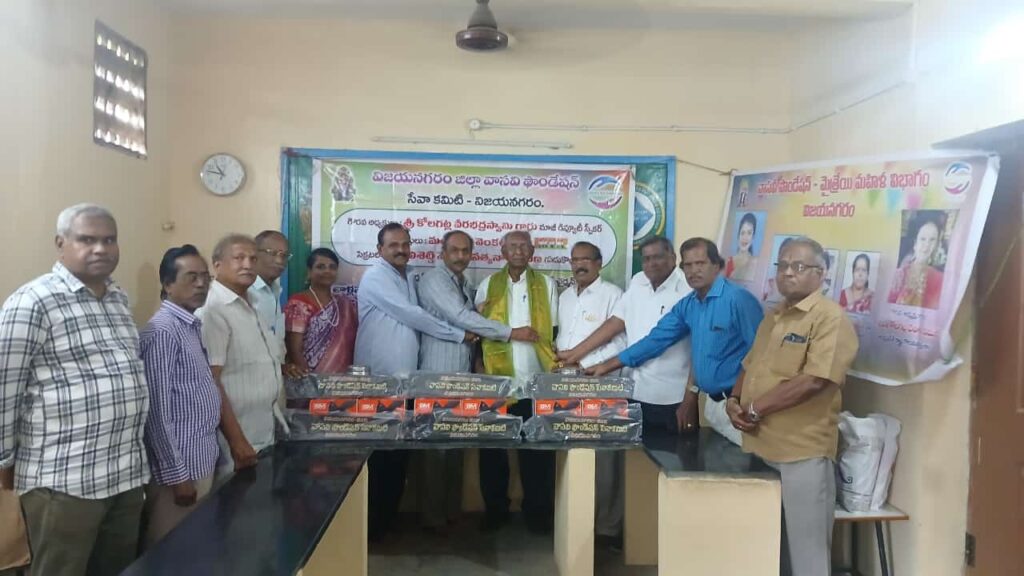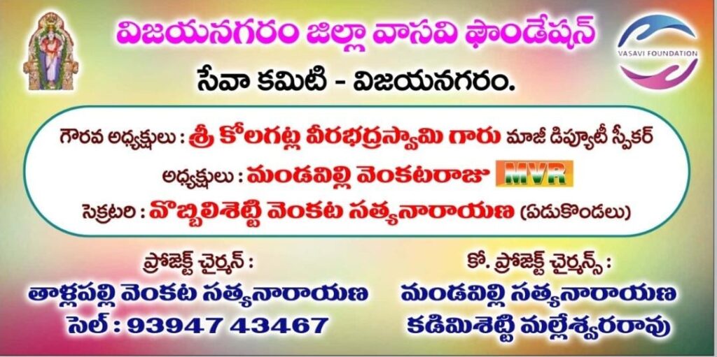 జిల్లా వాసవి ఫౌండేషన్……… అధ్యక్షులు… మండవిల్లి వెంకటరాజు…. సెక్రటరీ వబ్బిలి శెట్టి వెంకట సత్యనారాయణ ( ఏడుకొండలు )