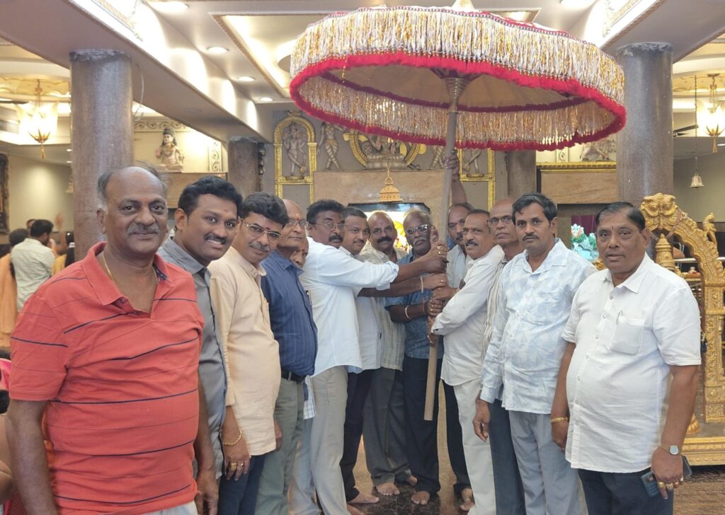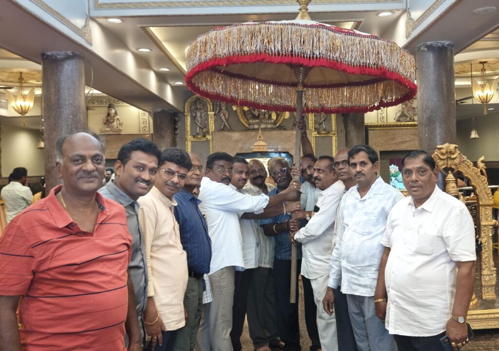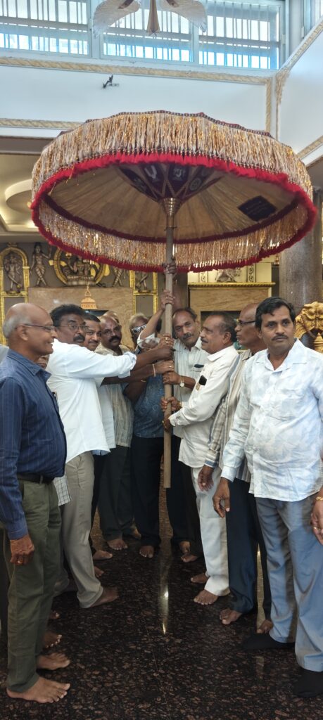 Today Vasavi Foundation, Vizianagaram team donated Temple Umbrella in Vasavi Temple in Vizianagram with a grand grand gathering and association team members. Many VIPs of Vizianagaram vysya community from various groups and associations extended their happiness in presenting this temple umbrella in Vizianagram and inspiration to all Vasavi Temple authorities.