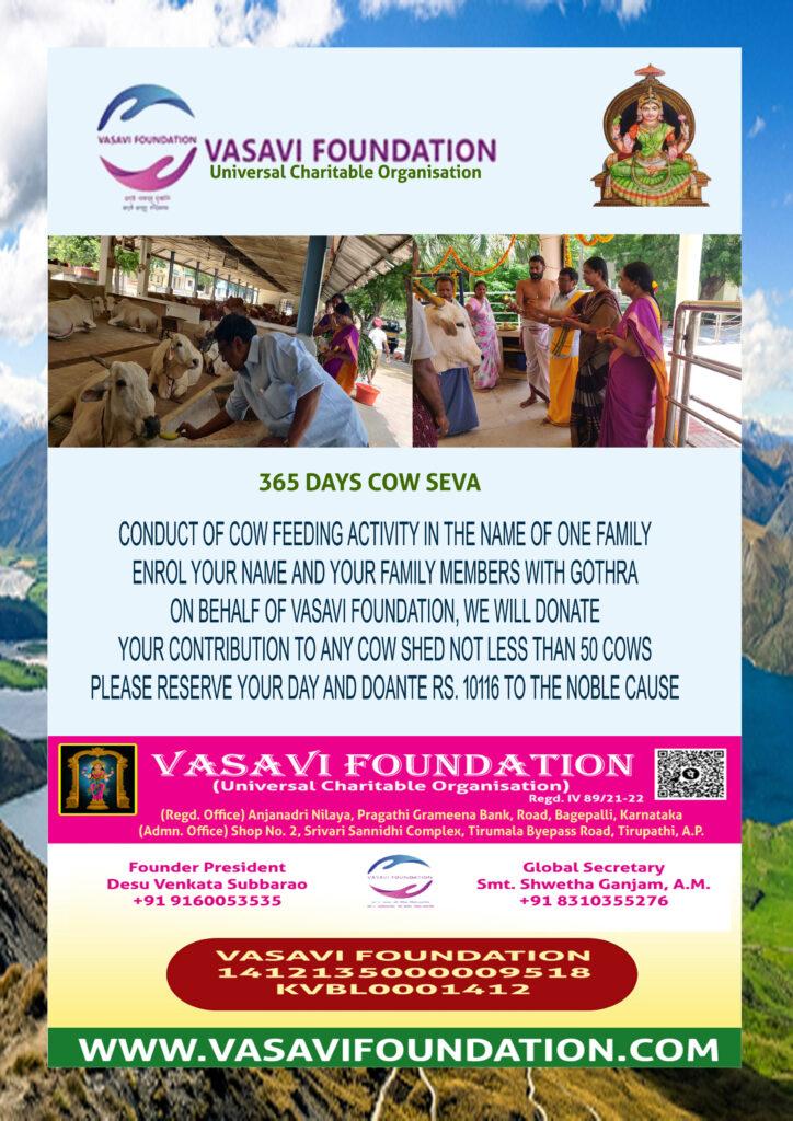 Vasavi Foundation is going to conduct 365 Days Cow Feed Event. Anybody interested to donate Cow Feed and Pooja in their family names and gotras donate Rs. 10,116.00 and reserve a day to feed nearly 100 cows.